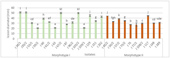 All tested Neofabraea-like isolates were pathogenic to apple fruits, producing typical Bull’s eye rot symptoms. Diameters of necrotic lesions were measured at 14, 21, and 28 days after artificial inoculation. The trial was terminated after 28 days. For representation, the data after 28 days of incubation were chosen and are presented in Figure 1. Neofabraea isolates caused three types of symptoms: yellowish lesions with brown margins; typical dark brown lesions, flat or slightly sunken; and brown lesions with concentric circles (Figure 2). Differences in aggressiveness among isolates was observed. Isolates J34/1 and J35/2 were highly aggressive and caused lesions 51.0 mm in diameter after 28 days of incubation, while the isolate J59/2 was the least aggressive (lesion diameter 20.5 mm). After 21 days of incubation, isolates started to produce conidiomata in the center of necrotic lesions and, by the termination of the experiment, 48% of studied isolates formed conidiomata on inoculated fruits. Two types of conidiomata on necrotic lesions were observed: small subepidermal conidiomata with white and creamy to dark brown color and large erumpent conidiomata with white mycelia in some cases (isolates J96/2, J129, and J67/2). The isolates from morphotype I formed larger lesions (38.5 mm on average) and 57.1% produced conidiomata, while isolates from morphotype II were less aggressive (30.9 mm on average) and formed conidiomata in 32.2% of cases, mainly subepidermal and small in size.
