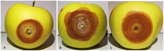Different decay symptoms on apple fruit inoculated with Neofabraea sp. after incubation of 35 days at room temperature: (a) Isolate J129—lesion with yellowish center and brownish margins; (b) Isolate J96/2—brownish lesion; and (c) Isolate J108/2—brownish lesion with concentric circles.