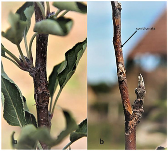 Two type of symptoms caused by Neofabraea sp. on apple branches: (a) developed canker caused by isolate J129; (b) canker with visible conidiomata under surface of branches caused by isolate J67/2. Pictures were taken 10 months post inoculation.
