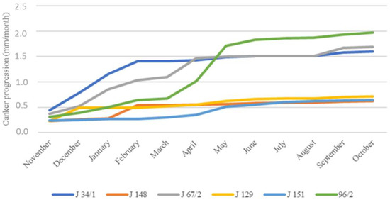 Isolates tested in the orchard were chosen based on their aggressiveness (isolates J34/1, J96/2, J67/2, and J151) and differences of symptoms on apple fruits (separated earlier in research, isolates J148 and J129). The length of canker, visibility of acervuli, and size of conidia are presented in Table 3. Two types of cankers were observed (Figure 3): the first type of canker, caused by isolates J148, J129, and J151, was shorter, but penetrated through the callus, sunken and depressed with visible fiber strings and isolated from healthy tissue without visible acervuli; the second type of canker, caused by isolates J34/1, J67/2, and J96/2, was longer and with variation in surface tissue color from orange to brown, intermittently. In second-type canker, surface tissue peeled off and revealed black acervuli. The development of apple canker progression and Neofabraea aggressiveness in a one-year study was observed (Figure 4).