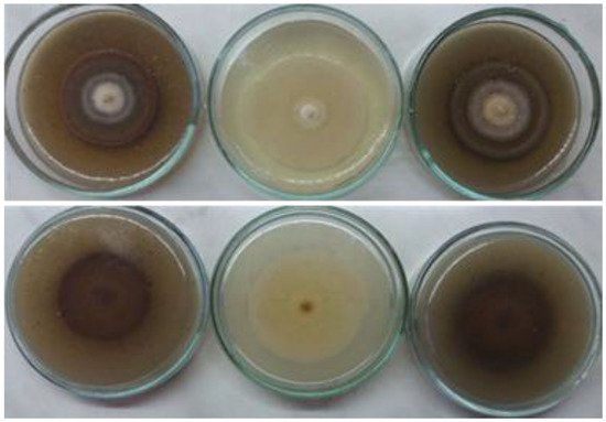 All tested Neofabraea isolates were able to grow on MEA at a pH range of 2–10. For most of the isolates, a maximal growth rate was recorded at pH 7, except for isolates J75 and J108/2, which had a maximal growth rate at pH 6. Isolates exhibited slower growth at pH levels lower than 5. The lowest growth rate was recorded at the most acidic medium (pH 2). In addition, differences in the appearance of aerial mycelium and pigmentation were observed on acidic versus alkaline medium. Significant difference in radial growth rate at different temperatures among isolates was observed. Eight selected isolates of Neofabraea were able to grow at low temperatures, but failed to grow at high temperatures (30 °C and 35 °C), with the exception of isolate J60, which was able to grow at all studied temperatures. The temperature optimum for four isolates was 20 °C, for J45/2 it was 25 °C, and for J60 and J108/2 it was 15 °C. Only isolate J117 exhibited the same growth rate at 20 and 25 °C. The most favorable medium for growth was OA, followed by PCA medium and MEA. The slowest growth was recorded on PDA and TA media with significant differences among isolates. Isolate J67/2 preferred PCA medium for growth relative to other isolates and culture media. Lack of aerial mycelium was noted on the culture media that provided the fastest growth of mycelia (Figure 7).