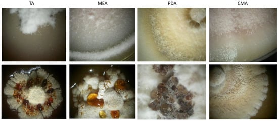 After 4 months of incubation, UV light did not show any impact on the overall production of conidiomata in isolates plated on PDA or MEA, but there was an impact in the case of isolate J108/2 plated on TA media. In addition, after two months of incubation, some changes in colony morphology were recorded; one isolate from morphotype I started to change color from white-creamy to dark brown (J35/1), while some isolates from morphotype II started producing more aerial mycelium, becoming lighter in color. Overall, after 8 weeks of incubation isolates from morphotype II formed visible black erupt conidiomata on the surface of aerial mycelium. On MEA and TA, large watery droplets, amber to yellowish in color, were visible on the mycelial surface, without conidia (Figure 6).