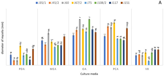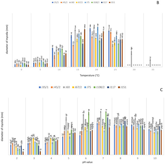 Effect of culture media (A), temperature (B), and pH (C) on growth of Neofabraea isolates. * Separation and group means were compared by Duncan’s test at p < 0.05; letters used for the definition of homogeneity belong to the English and Greek alphabet.