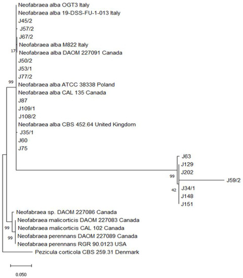 Twenty-five selected Neofabraea spp. isolates were identified at the species level by amplification and sequencing of the internal transcribed spacer (ITS) region of ribosomal DNA (rDNA) and portions of the 16S mitochondrial rRNA (mtSSU). The final length of ITS sequences ranged from 301 to 495 bp (base pairs) and from 302 to 625 bp for mtSSU, respectively. There was a similarity of over 99% with several N. alba sequences deposited in GenBank (KT963910.1 KT963903.1, KT963897.1, MH924828.1, etc.) for both ITS and mtSSU sequences. The jointed phylogenetic tree was separated in two clades, one which obtained all N. alba sequences, and another consisting of sequences of N. malicorticis, N. perennans, and N. sp. nov. The ML analyses showed N. alba sequences separated in two groups, with a bootstrap value of 99%. The first group obtained sequences of isolates obtained in this study and GenBank isolates, while another group was composed only of identified isolates obtained in this study (J63, J129, J202, J59/2, J34/1, J148, J151). The most distant isolate in the second group was J59/2, followed by J63, presented in a separated branch (Figure 8). After analyzing separated phylogenetic trees of ITS and mtSSU sequences and concatenated tree, we concluded that the merged tree separated N. alba isolates more precisely and gave more insight into the groups formed within the specie, but with less available reference isolates in the GenBank database (data unpublished).