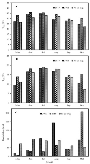 Mean monthly maximum temperature (Tmax, A) and minimum temperature (Tmin, B), and total precipitation (C) during sorghum growing season (May–October) and 30-year average (1981–2010) at Bushland, Texas (source: http//ncdc.noaa.gov, accessed on 15 August 2022).