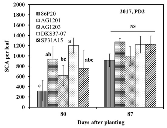 In this study, SCA infestation occurred naturally and started in early September 2017 and the middle of July 2018. Apparently, environmental conditions largely affected the occurrence of SCA. The late SCA occurrence in 2017 could be related to the relatively lower temperature during the growing season as compared to the 2018 season. For both years, SCA infestation occurred mainly in PD2 plots. In 2018, temperatures dropped to 15 °C between 75 and 83 DAP, and it was observed that SCA populations quickly declined (Figure 3). It has been documented that SCAs are temperature sensitive, and population growth slows or declines when temperature reaches the range of 15–18 °C, but it is reported that this population drop is more likely due to dispersal than mortality [12,35,36].