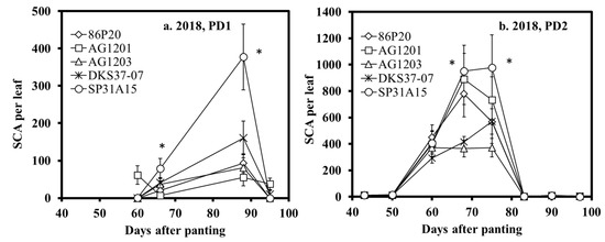 Average sugarcane aphid (SCA) population per leaf in each hybrid observed for the PD1 (a) and PD2 (b) grain sorghum in 2018. * Indicates the significant differences (p < 0.05) in SCA per leaf among hybrids.