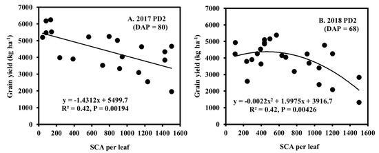 Relationship between SCA and grain yield for PD2 in 2017 (A) and 2018 (B). Each dot is the data of yield and SCA per leaf in each plot.