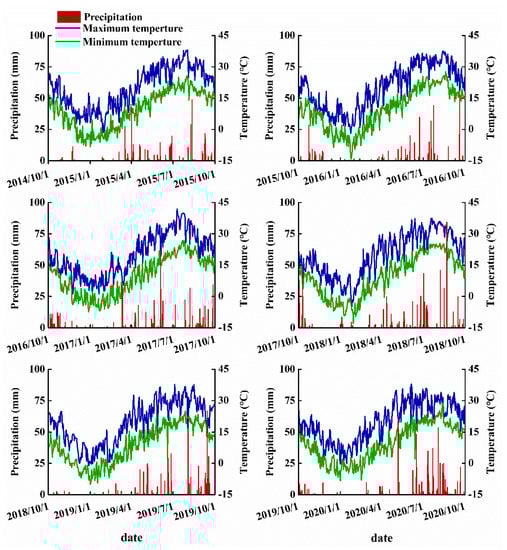 Daily maximum and minimum temperatures and precipitation during 2014–2020. Source: National Meteorological Observing Station in Yangling, Shaanxi Province, China.