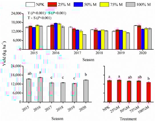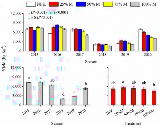 Wheat yield varied from 1643 to 8438 kg ha−1 during six experimental seasons (Figure 2). ANOVA indicated significant seasonal effects on wheat yield as follows: 2018 < 2019 < 2020 < 2015 and 2016. Compared with 25% M, 100% M significantly reduced wheat yield, while other treatments showed similar yield to the above two treatments. Season significantly interacted with treatment impacting wheat yield; for example, both 25% M and 50% M treatments showed similar or higher yield relative to NPK treatment in 2016, 2017, 2018, and 2019, but the opposite was true in other seasons.