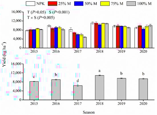 Maize yield ranged from 4847 to 11,104 kg ha−1 (Figure 3). Maize yield in 2018 was significantly higher than that in the remaining seasons, and it was also higher in 2016, 2019, and 2020 than in 2015 and 2017. Additionally, season and treatment presented a significant interactive effect on maize yield. For example, organic manure treatments showed distinctly lower yield than NPK treatment in 2016 and 2017, but no difference was observed in the other four seasons.