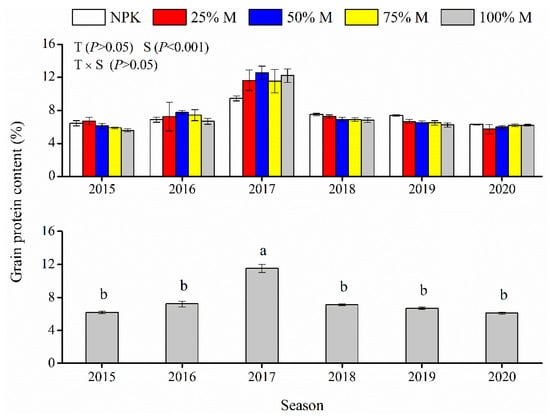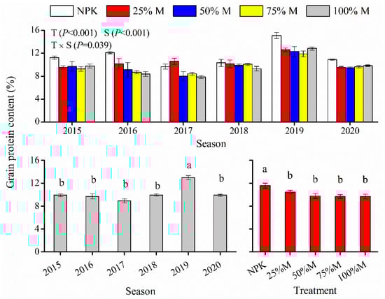 Grain protein content in wheat ranged from 7.9% to 15.1% (Figure 5). Compared with NPK, substitution of inorganic fertilizer with organic manure significantly decreased wheat grain protein content by 9.7–16.4%. Grain protein content was significantly higher in 2019 than in the other seasons. Season and treatment interaction affected grain protein content; for example, all treatments presented similar grain protein content in 2018, but organic manure treatments generally gave lower values in other seasons.