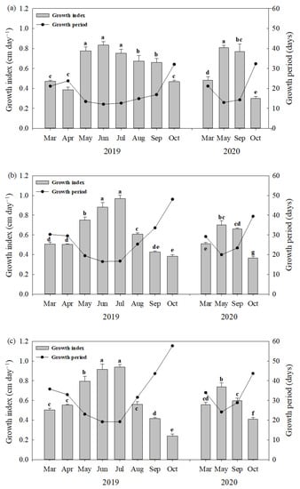 The estimated growth index of barley sprouts varied with the sowing time, but its change pattern was similar for all lengths of the sprouts sampled (Figure 1). For 15 cm barley sprouts sampled in 2019 (Figure 1b), the highest value of GI was found in July (0.96 cm day−1), followed by June (0.88 cm day−1), May (0.75 cm day−1), August (0.60 cm day−1), and so on. Meanwhile, the lowest GI was observed in October (0.36 cm day−1). In 2020, the highest GI value was found in May (0.70 cm day−1), followed by September (0.66 cm day−1), March (0.51 cm day−1), and October (0.36 cm day−1).