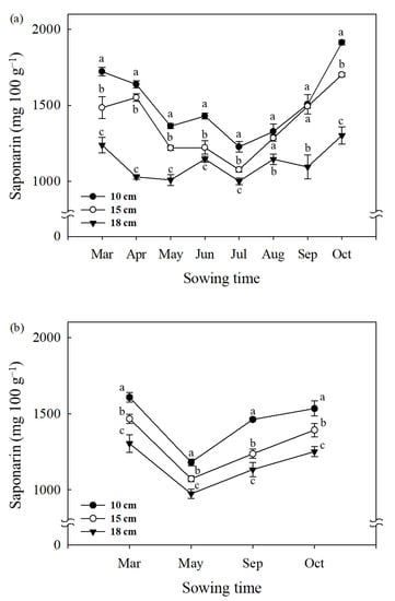 The saponarin content of barley sprouts varied significantly with the sowing time (Figure 2). The saponarin content presented a trend of decrease from March to July and increased later from August to October (Figure 2a). The highest saponarin contents were found in sprout samples grown in October (1913 mg 100 g−1 for 10 cm, 1701 mg 100 g−1 for 15 cm, and 1302 mg 100 g−1 for 18 cm), whereas the lowest contents were observed in July (Figure 2a). In the second year of the experiment, the change in saponarin content of barley sprouts depending on the sowing time appears to be similar. The highest values were found in barley sprouts (10, 15, and 18 cm) sown in March (1608, 1466, 1304 mg 100 g−1, respectively), followed by October (1534, 1393, 1251 mg 100 g−1, respectively), September (1462, 1236, 1133 mg 100 g−1, respectively), and May (1181, 1072, 974 mg 100 g−1, respectively).