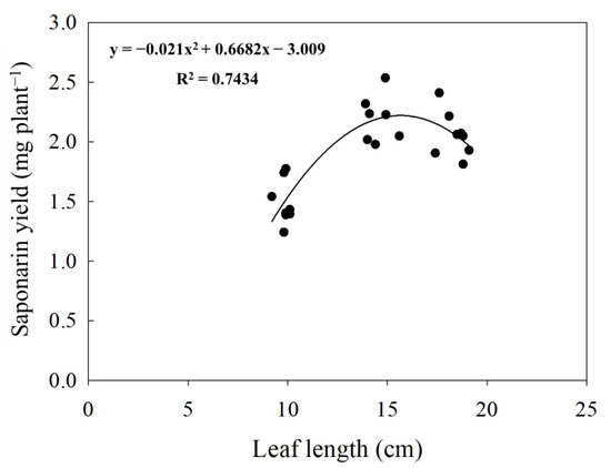 In general, it is clear that the saponarin content of barley sprouts tended to decrease with the increase in primary leaf length sampled in all two years (10 cm > 15 cm > 18 cm). On the other hand, the total saponarin yield per plant showed a different tendency depending on the leaf length (Table 3). The most significant yield of saponarin was found in the leaf samples of 15 cm length (2.2 mg plant−1), followed by 18 cm (2.0 mg plant−1), and 10 cm (1.4 mg plant−1). We also found a significant polynomial relationship between the yield of saponarin (mg DW plant−1) and the length of leaves (r2 = 0.85, p < 0.001) (Figure 3).