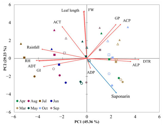 Principal component analysis (PCA) of the plant parameters with environmental factors. Scores for first two principal components of the sowing times (from March to November). Sowing times are indicated by different colors. Different shapes of symbols indicate the following: circle, 10 cm of leaf length; square, 15 cm; triangle, 18 cm; closed symbols, data in 2019; open symbols, data in 2020. Loading plot of the plant parameters of saponarin (blue arrow) and FW, leaf length, GI, GP, and climatic factors (red arrow). Abbreviations—FW, fresh weight; GI, growth index; GP, growth period; ADT, average daily temperature; DTR, daily temperature range; ACT, accumulated temperature; ALP, average light period; ADP, average daily photons; ACP, accumulated photons; RH, relative humidity.