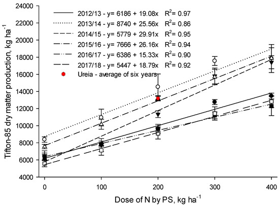 The mean values of DMP of the Tifton-85 grass in the 2012/2013 to 2017/2018 for the control, Min200 (urea) and PS100, PS200, PS300, and PS40 treatments were 6.785, 13.197, 8.597, 11.234, 11.169, and 15.238 kg ha−1 (Figure 1).