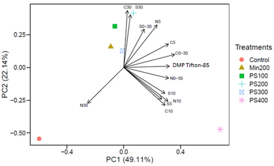 C, N, and S stocks in the 0–30 cm layer of soils treated with PS were, in general, equal to or higher than those in the control and Min200 treatments (Table 5). The PCA showed that the cumulative increase in Tifton-85 dry mass during six agricultural crops increased C and N stocks in the 0–30 cm layer (Figure 2). It is noteworthy that the variables DMP and C, N, and S (0–30 cm) stocks are in the opposite position to the control treatments, and in an intermediate position to the PS400 and the other treatments (PS100, PS200, PS300, and Min200) (Figure 2). This pattern corroborates the lower stocks of C and S (0–30 cm) and N (0–5 cm) in the control treatment; and similar values among the Min200 (urea) and PS100, PS200, and PS300 treatments (Figure 2, Table 5).