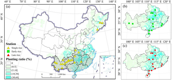 Spatial distribution of rice stations and planting ratio. (a–c) Early rice, single rice, and late rice, respectively. The shading in (a) indicates the planting areas of early and late rice.