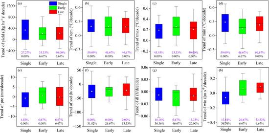 Trends of yield (a) and climatic factors (b–h) in rice-growing season from 1981 to 2018. Purple fonts indicate the percentage of sites that have significantly increased, and black fonts indicate the percentage of sites that have significantly decreased. (b–h) The trend of mean temperature, maximum temperature, minimum temperature, precipitation, sunshine duration, photoperiod, and wind speed, respectively.