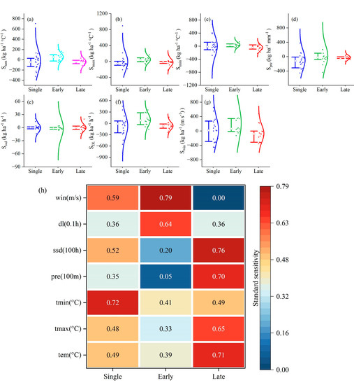 Sensitivity of rice yield to climatic factors (a–g) and relative importance (h). (a–g) Sensitivity of rice yield to mean temperature, maximum temperature, minimum temperature, precipitation, sunshine duration, photoperiod, and wind speed, respectively.