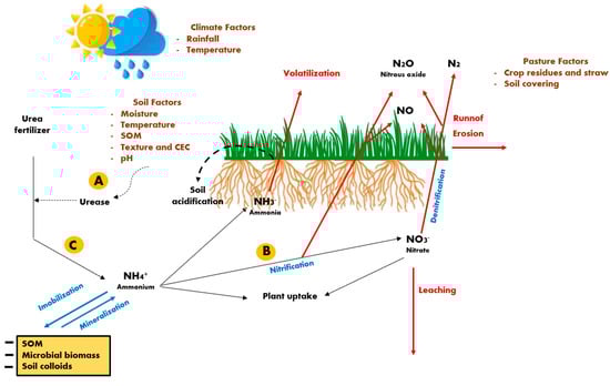 Simplified diagram showing the fate of N from urea fertilizers in tropical perennial grasses. Letters A, B and C represent the point of action of urease inhibitors, nitrification inhibitors, and polymer-coated urea fertilizer, respectively. Adapted from [28].