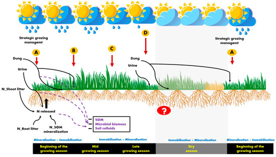 On the other hand, animal excretions are considered important contributors to GHG emissions with urine being considered the main source of N2O emissions during the wet season [27]. Once the proportion of excreta increases with increasing stocking rates, and considering that nutrients, particularly from urine, are concentrated in small areas, strategic grazing [1] and N fertilization could potentially reduce negative environmental impacts and N losses and improve N release from mineralization (Figure 2).