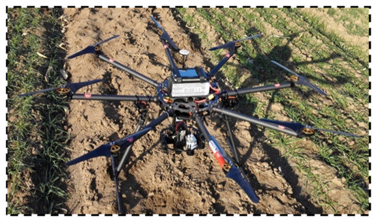 The visible and TIR RS images were collected at the Branch of National Wheat Improvement Center, Yangzhou, Jiangsu, China. The study area has a leading research and development platform for wheat molecular breeding. It can provide us good experimental sites for collecting high-quality UAV images of wheat at different growth stages. A miniaturized eight-rotor electricity-driven UAV was selected to simultaneously deploy the HD DSC-QX100 digital camera (Sony, Tokyo, Japan, 5472 × 3648 pixels) and the optris PI thermal imaging camera (Optris GmbH, Berlin, Germany) with a resolution of 0.05 K (Figure 1). The UAV can have a load of about 6 kg with the endurance time of 20 min and a flight altitude of 50 m.