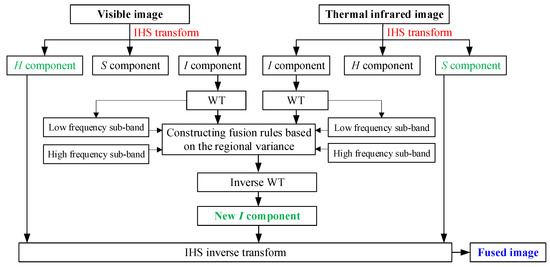 The general workflow of the proposed method to fuse the visible and TIR images. IHS is the intensity hue saturation; WT is the wavelet transform; and H, S, I refer to the hue, saturation, intensity, respectively.