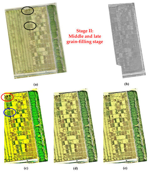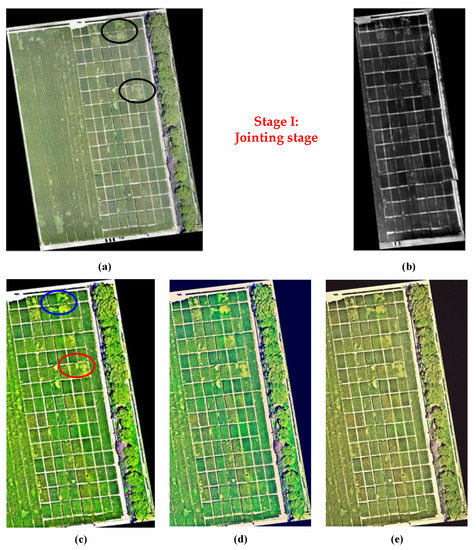 The fused images of two growth stages were respectively obtained using our proposed method, the IHS transform and regional variance (Figure 3 for Stage I and Figure 4 for Stage II). In comparison with original visible and TIR images, it can be observed that the fused images showed better visual performance than original single image. In comparison with original visible image (Figure 3a and Figure 4a), the color contrast and texture difference had been greatly enhanced (Figure 3c–e and Figure 4c–e). It seemed that the three-dimensional sense had been also improved. More fine differences could be easily found in the fused image, such as the regions highlighted in red and blue ovals (Figure 3c and Figure 4c). When comparing the three fused images of two growth stages, it can be found that the images derived from our proposed method show best visual performance. The abnormal phenomena in wheat fields can be easily found.