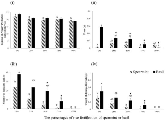 Mean ± of progeny production (i), frass (ii), number of damaged kernels (iii) and weight of damaged kernels (iv) of Sitophilus oryzae. Within each fortification (rice fortified with spearmint or basil) means followed by the same uppercase letter are not significantly different (Tukey-Kramer HSD test at 0.05). Where no letters exist, no significant differences were noted. Within each treatment, means with asterisks (*) indicated significant differences between the two fortified commodities (spearmint and basil) tested according to Student’s t-test at 0.05. t-test parameters for frass at 25% were t = 6.794, p = 0.020; at 50%, were t = 6.671, p = 0.021; at 75% were t = 28.033, p < 0.001; and at 100% were t = 5.557, p = 0.033. For NDK, t-test parameters at 50% were t = 8.546, p < 0.011 and at 75% were t = 12.189, p = 0.003. For WDK, t-test parameters at 50% were t = 7.235, p = 0.017 and at 75% were t = 15.086, p = 0.0017. In all cases, dftotal = 39.