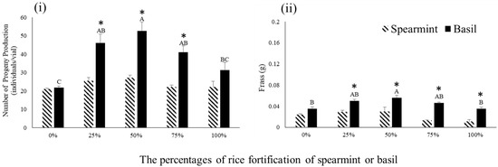 Regarding the main effects, only fortification was significant (Table 2). The offspring recorded in the fortified rice with spearmint ranged between 17.8 and 19.7 adults per vial, while in the fortified rice with basil, it ranged between 17.9 and 22.2 adults per vial (Figure 2i). There were no significant differences among the different fortification percentages (Figure 2i).