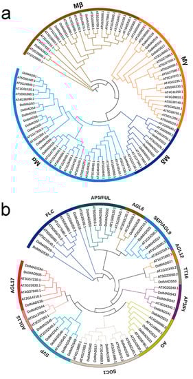 - Parenicová, L.; De Folter, S.; Kieffer, M.; Horner, D.S.; Favalli, C.; Busscher, J.; Cook, H.E.; Ingram, R.M.; Kater, M.M.; Davies, B. Molecular and phylogenetic analyses of the complete MADS-box transcription factor family in Arabidopsis: New openings to the MADS world. Plant Cell 2003, 15, 1538–1551. [Google Scholar] [CrossRef]