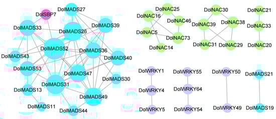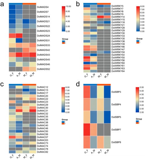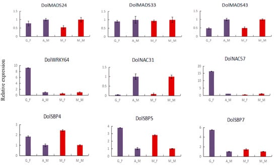 3.5. RT-qPCR Analysis of the DolMADSs, DolWRKYs, DolNACs, and DolSBPs