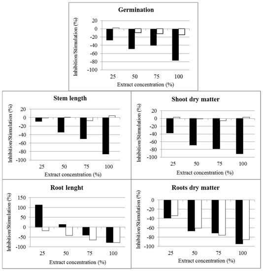 The results of the current study indicated the negative effect of P. serotina litter extracts with the highest concentration on tested crop species. In the case of S. alba, it concerned both germination and growth of whole seedlings, while for F. esculentum, only the reaction of roots of young plants was observed. Previous studies showed the strong influence of extracts from decomposed black cherry leaves on the length of Pinus sylvestris roots with a slightly weaker effect on stem growth []. The greater sensitivity of the roots compared with above-ground parts of the tested plant species has also been demonstrated by other authors in allelopathic tests [,]. Sarkar et al. [] suggest that constant contact of young roots with filter paper, treated with the analyzed solution, and direct uptake by root hairs, may cause greater sensitivity of this part of the seedling to biologically active compounds.