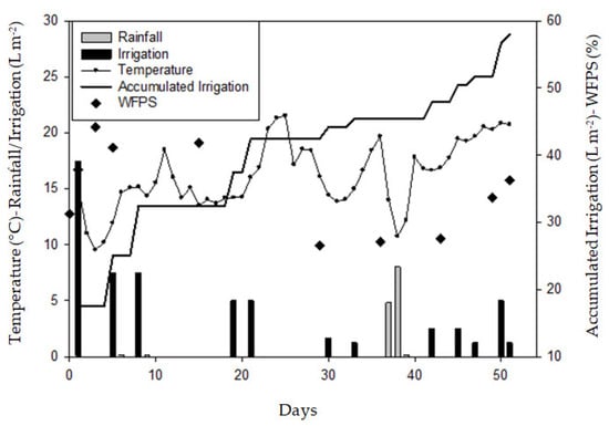Mean temperature (°C), WFPS: water-filled pore space (%), rainfall (L m−2), daily irrigation (L m−2), and accumulated irrigation (L m−2) at the experimental site.