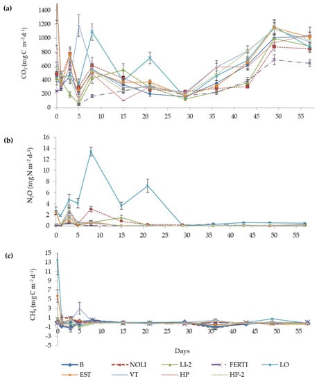 Daily fluxes of (a) CO2, (b) N2O, and (c) CH4 from treatment applications during the 55-day monitoring period. HP: wastewater treatment biosolid + Phoenix dactilifera leaf prunings; HP-2: agrifood sludge from pear processing wastewater + Phoenix dactilifera leaf prunings; VT: vermicompost cow manure; LO: biosolid; EST: cow manure; NOLI: NPK inorganic fertilizer; LI-2: NPK + DMPP inorganic fertilizer; FERTI: fertigation. Bars represent the standard error of the mean.