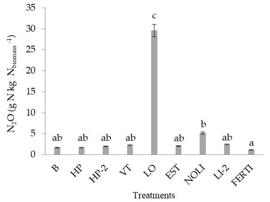 Comparing the results obtained in the treatments with inorganic fertilization, we can see that in the case of the FERTI treatment, the emission values were the lowest of all those in the experiment because this treatment did not provide N-NH4+. With NOLI and LI-2, which contributed a proportion of N-NH4+, the emissions were higher in the plots treated with NOLI. This could be a consequence of the nitrification inhibitor substances (DMPP) in the LI-2 fertilizer, since these substances have been shown to be effective in mitigating N2O emissions in soil. According to Huérfano et al. [53], between 30 and 50% of N2O emissions can be mitigated by using nitrification inhibiting fertilizers.
