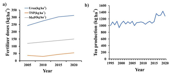 Effect of long-term traditional fertilizer on tea production. (a) Recommended doses of urea, TSP, and MoP fertilizer for tea production and (b) tea-production trend in Bangladesh during 25 consecutive crop years (1995–2020). Source: Fertilizer Recommendation Guide (FRG) 2005, 2012, 2018 and Bangladesh Tea Board (BTB), 2020.