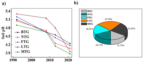 Changes in soil pH as influenced by long-term traditional fertilization. (a) Soil pH level and (b) percentage of pH reduction of five tea gardens (BTG, NTG, FTG, LTG, and MTG) from 1992 to 2020. BTG: BTRI Tea Garden, NTG: Nurjahan Tea Garden, FTG: Finlay Tea Garden, LTG: Lakkatora Tea Garden, MTG: Malnichara Tea Garden. Source: Soil Resource Development Institute (SRDI), 2020.
