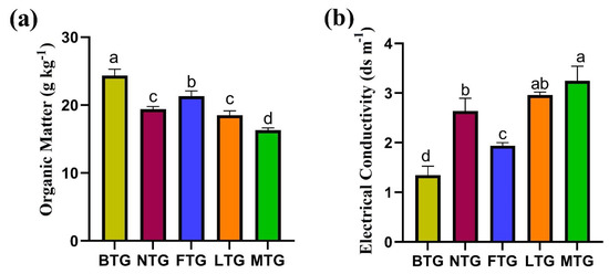 Effect of reduced soil pH on (a) OM (g kg−1) and (b) EC (dsm−1) on the tested gardens of BTG, NTG, FTG, LTG and MTG due to long-term traditional fertilization. BTG: BTRI Tea Garden, NTG: Nurjahan Tea Garden, FTG: Finlay Tea Garden, LTG: Lakkatora Tea Garden, MTG: Malnichara Tea Garden, OM: organic matter (g kg−1), EC: electrical conductivity (ds m−1). The statistics given are the averages of three replicates, with the vertical bars indicating the standard deviation. According to least significant difference test, the means signified by the same letter did not differ substantially at p < 0.05.