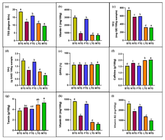 Effect of reduced soil pH on biochemical and nutritional qualities of tea leaf. (a) TSS, (b) vitamin C, (c) TFC, (d) TPC, (e) DPPH, (f) caffeine, (g) tannin, (h) vitamin B1, and (i) vitamin B2 of tea leaf in BTG, NTG, FTG, LTG and MTG. BTG: BTRI Tea Garden, NTG: Nurjahan Tea Garden, FTG: Finlay Tea Garden, LTG: Lakkatora Tea Garden, MTG: Malnichara Tea Garden, TSS: total soluble solid (degree Brix), vitamin C (mg/100 g), TFC: total flavonoid content (mg QE/100 g sample), TPC: total polyphenol content (g GAE/100 g sample), DPPH: 2,2-diphenyl-1-picryl-hydrazyl (% scavenging activity), caffeine (g/100 g), tannin (g/100 g), vitamin B1 (mg/100 g), vitamin B2 (mg/100 g). The statistics given are the averages of three replicates, with the vertical bars indicating the standard deviation. According to least significant difference test, the means signified by the same letter did not differ substantially at p < 0.01.