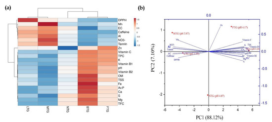 Biochemical and nutritional qualities of tea leaf as influenced by reduced soil pH. (a) Heatmap and (b) principal component analysis (PCA) shows the effect of long-term traditional fertilization on biochemical and nutritional quality of soils and tea leaves in BTG, NTG, FTG, LTG, and MTG tea gardens of Bangladesh.
