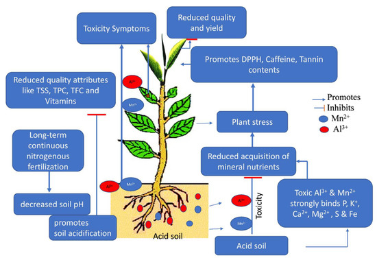 Acidification of tea garden soil is a critical issue throughout the world for the production of quality tea beverages. The continuous application of nitrogenous fertilizers in the form of urea decreased soil pH by releasing nitrate (NO3−), ions which caused depletion in essential plant nutrients and toxicity of manganese (Mn2+) and aluminum (Al3+) in soils, thereby suppressing leaf quality, with a reduction in overall harvest. The high amounts of Mn2+ and Al3+ would induce toxicity and lower the availability of phosphorus (P), potassium (K+), calcium (Ca2+), magnesium (Mg2+), sulfur (S), and iron (Fe) ions in garden soil due to long-term traditional fertilization. As a result, plant availability, uptake, transport, and utilization of these essential nutrients were severely hampered. Consequently, the quality of tea leaves deteriorated, as evidenced by lower levels of TSS, TFC, TPC, vitamin C, vitamin B1, and B2 concentration. Moreover, the rapid increases of free-radical scavenging activity (DPPH) and caffeine and tannin concentration in tea leaves indicating plants were under stress, as shown in Figure 6. Therefore, this study concludes that the lower soil pH induced by continuous application of nitrogenous fertilizers decreased the availability of native nutrient pools in soil and decreased tea leaf quality and production. Further molecular studies are required to comprehend the mechanisms and establish appropriate management strategies to avoid excessive fertilizer applications in tea gardens.
