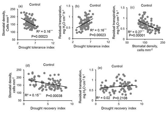4.4. Drought Stress Tolerance Index Was Negatively Correlated with Stomatal Density but Positively Correlated with the Residual Transpiration of Irrigated Plants
