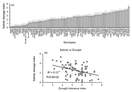 4.5. Correlation between Drought and Salinity Stress Tolerance