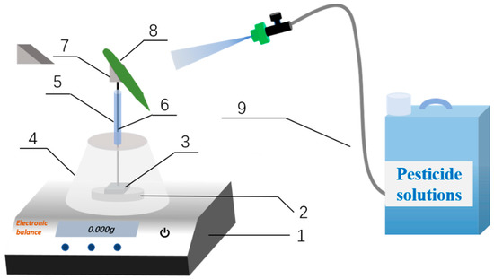 Based on the previously reported method [20], we have made improvements and designed the schematic diagram of the device shown in Figure 1 to conduct an indoor evaluation of the deposition and retention of pesticide solution on leaves. Healthy wheat leaves at 5–7 leaf stages were selected, and the leaf area (S) was measured by the YX-1242 leaf area measuring instrument (Beijing Yaxin Technology Co., Ltd., Beijing, China). The wheat leaves were glued on the self-made 0°, 30°, 45°, and 60° stage with double-sided tape. The pesticide solution was put into the spray device. The stage was connected to the bottom tray through a strut. The droplets sprayed out of the sprayer were separated by the isolation hood to prevent droplets from depositing in the platforms, pillars, and electronic balance, ensuring that the electronic balance reading accurately reflects the weight of droplets deposited on the leaves of wheat. A small sprayer was used for spraying. The distance between the nozzle and the blade was about 40 cm to reduce the pressure of blowing air to the platform. During the spray process, when pesticide solution began to flow from the leaf, the maximum reading of the balance W1 (g) was recorded, and the spray was stopped. The liquid no longer flowed from the leaf, and the balance was read W2 (g). Then the point of run-off (POR, mg/cm2) and the maximum retention (Rm, mg/cm2) of the leaf according to formulas (1) and (2) were calculated.