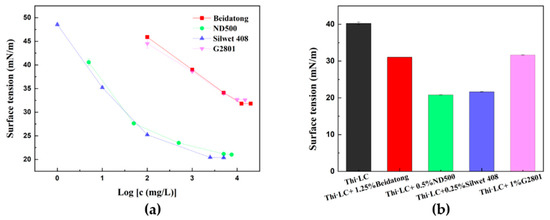 (a) Critical micelle concentration of four adjuvants. (b) The surface tension of Thi · LC without and with four adjuvants.