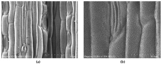 Scanning electron micrograph of the wheat leaf surface. Magnification: Scanning electron micrograph of the wheat leaf surface. Magnification: (a) 500 and (b) 1.5 k.