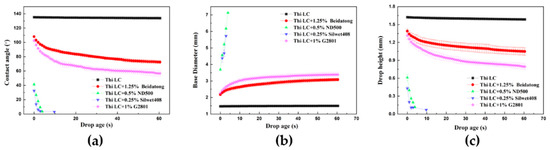 Due to the existence of micro and nanostructure on the surface of wheat leaves, there is a lot of air at the contact between droplets and wheat leaves, which is difficult to spread on the leaf surface, so it is easy to fall off [29]. The contact angle is usually used to evaluate the wettability of pesticide solution on the target surface. The measured contact angle of water droplets on wheat leaves is about 140°, indicating that wheat leaves are superhydrophobic interfaces. Figure 4 shows the morphological changes of Thi · LC and Thi · LC droplets added with four adjuvants on wheat leaves (including contact angle, droplet height, and droplet diameter). Thi · LC without adjuvants had the worst wettability on wheat leaves. The contact angle of the droplet did not change, and the height and contact diameter of the droplet almost did not change in 60 s (Figure 4). The changes of Thi · LC droplets with ND500 or Silwet408 adjuvants are also very sharp. The solutions with these adjuvants reach the super wetting state in a short time. The changing trend of the solution added with Beidatong and G2801 adjuvants are similar within 1 min. The contact angle and height of the droplet decrease slowly, and the diameter of the droplet increases, indicating that droplet is gradually wetting the leaf surface. For rough surfaces with microstructure/nanostructure surface morphology, the Cassie-Baxter wetting model and the Wenzel model are applicable.